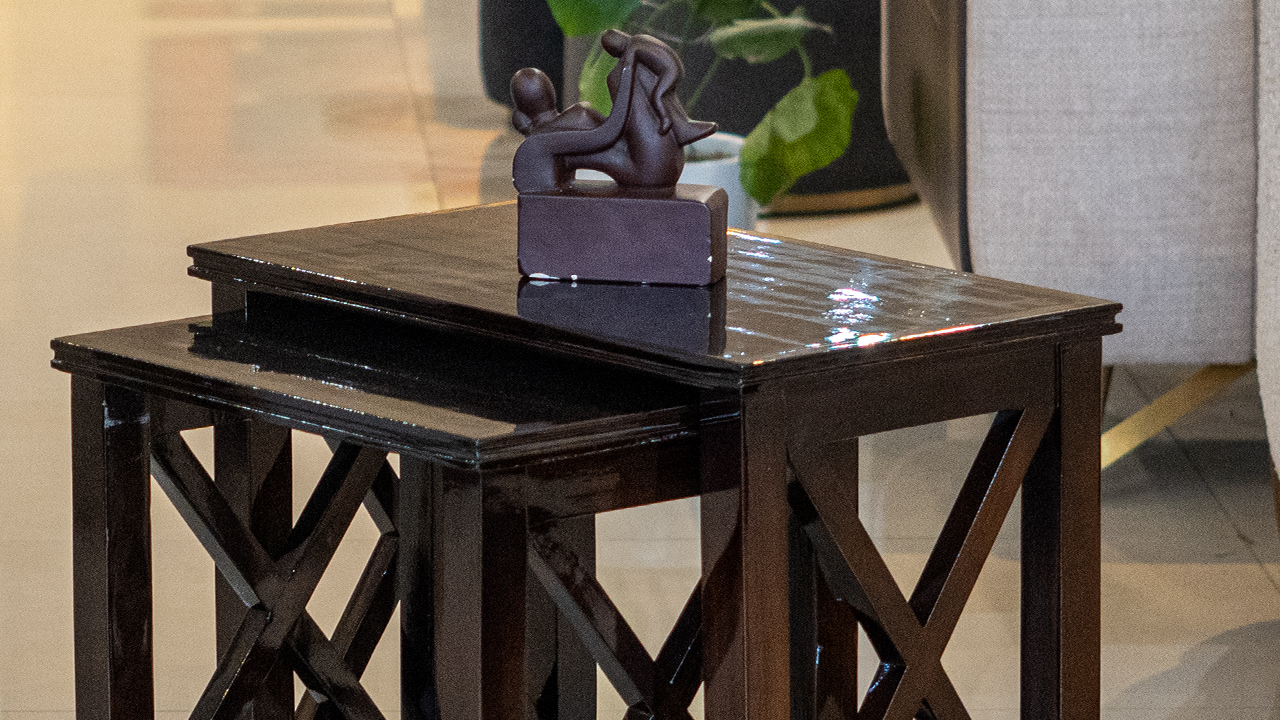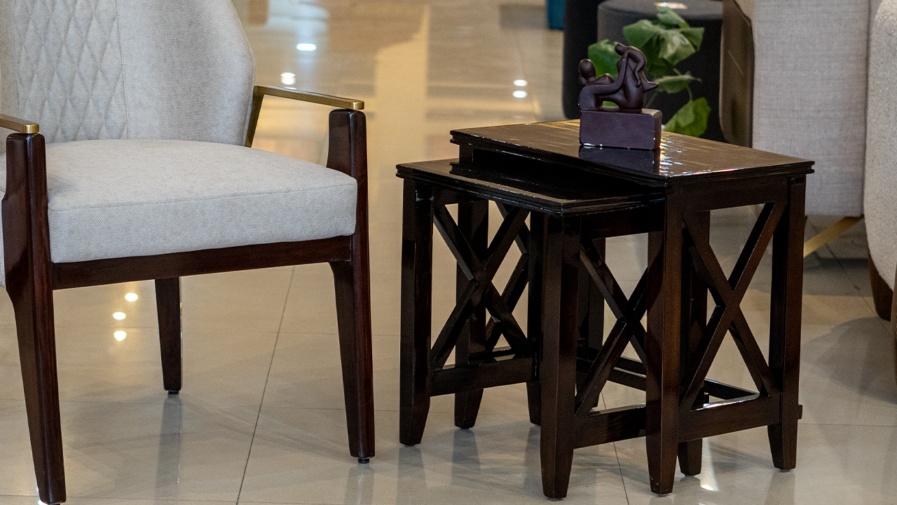 "The side table is a dark brown wooden piece with a simple yet elegant design. It features an X-shaped support structure on each of its four legs, adding a touch of rustic charm. The table's overall look blends nicely with the surrounding furniture in the spacious room."