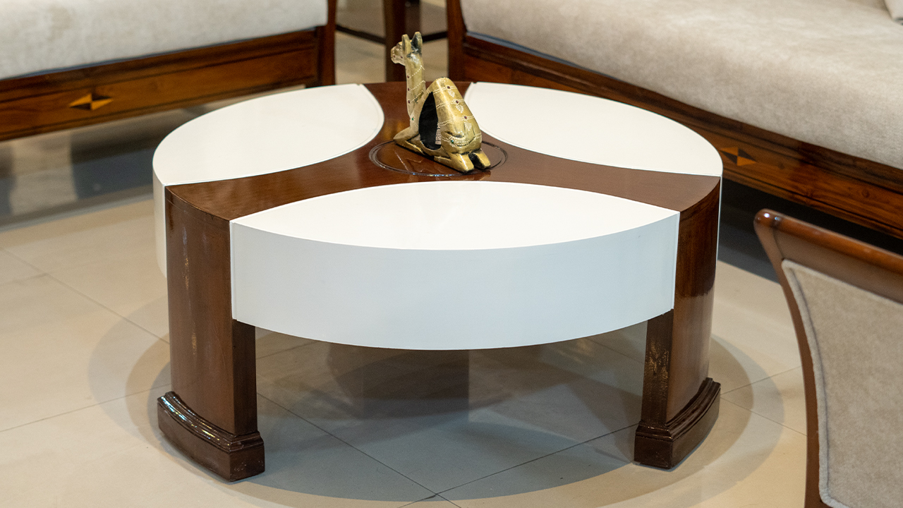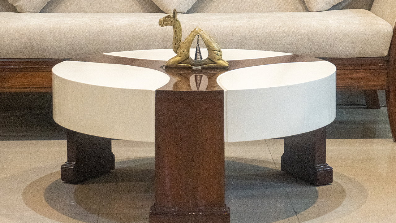 "The center table is a unique, asymmetrical piece with a blend of textures and shapes. It features two white, curved rectangular sections connected by a reflective surface, possibly glass or polished metal. A small bronze sculpture sits atop the reflective area, adding a touch of artistry. The table's design creates a visually interesting focal point in the room, complementing the surrounding chairs and dark wooden table."