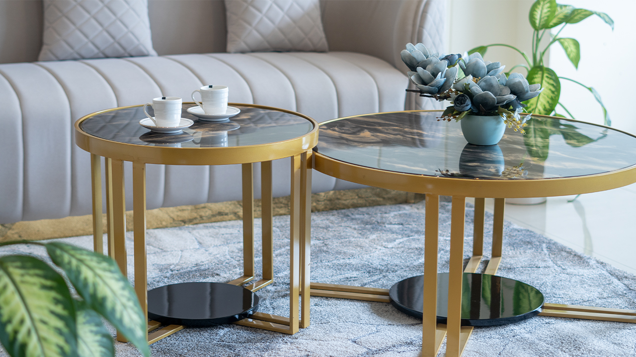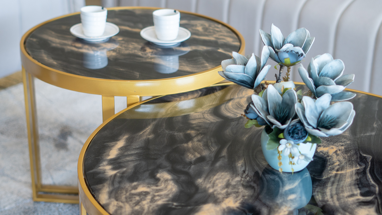 "This set of center tables embodies chic modernity with a touch of classic charm. Featuring a harmonious pairing of two round tables in varying heights, the design offers both aesthetic layering and functional flexibility. The glossy, marble-patterned tabletops bring a luxurious sheen, effortlessly elevating the look of the space. Complementing the tops, the gold-toned metallic frames add a sense of opulence while maintaining a light, airy structure. The open base design incorporates circular black accents at the bottom, adding a grounded contrast and enhancing the visual balance."