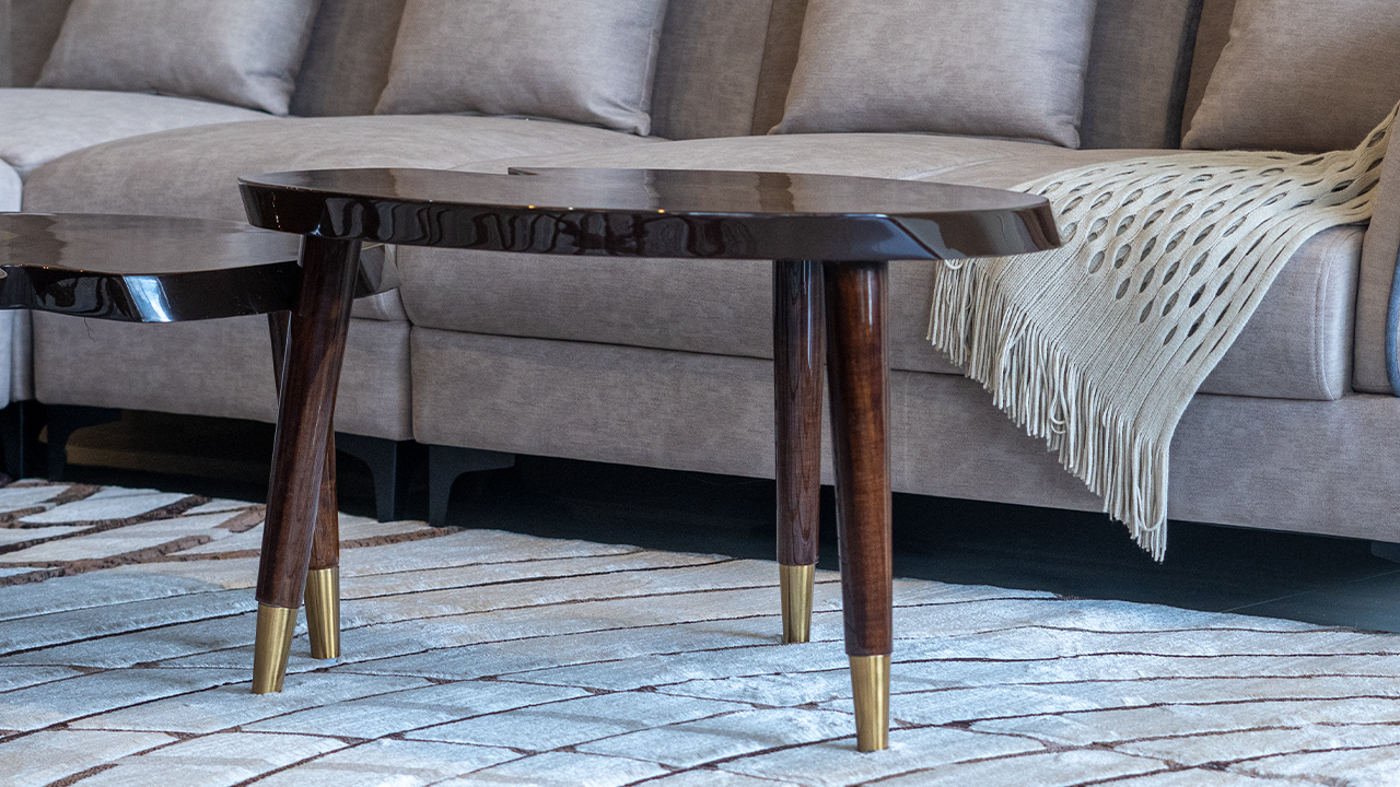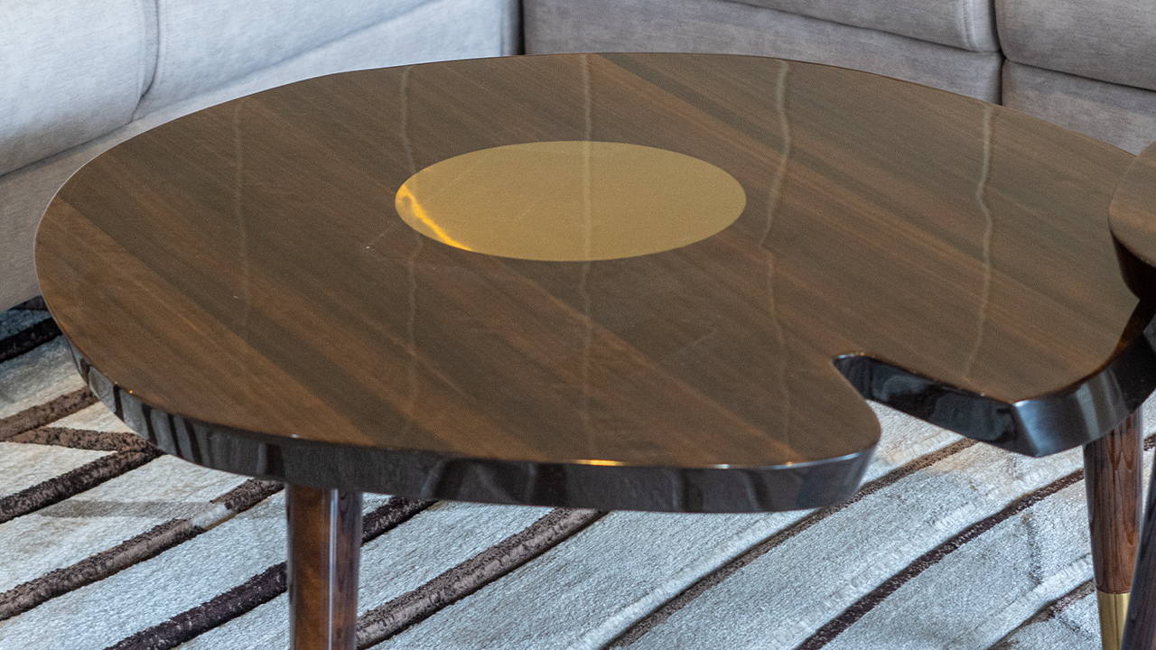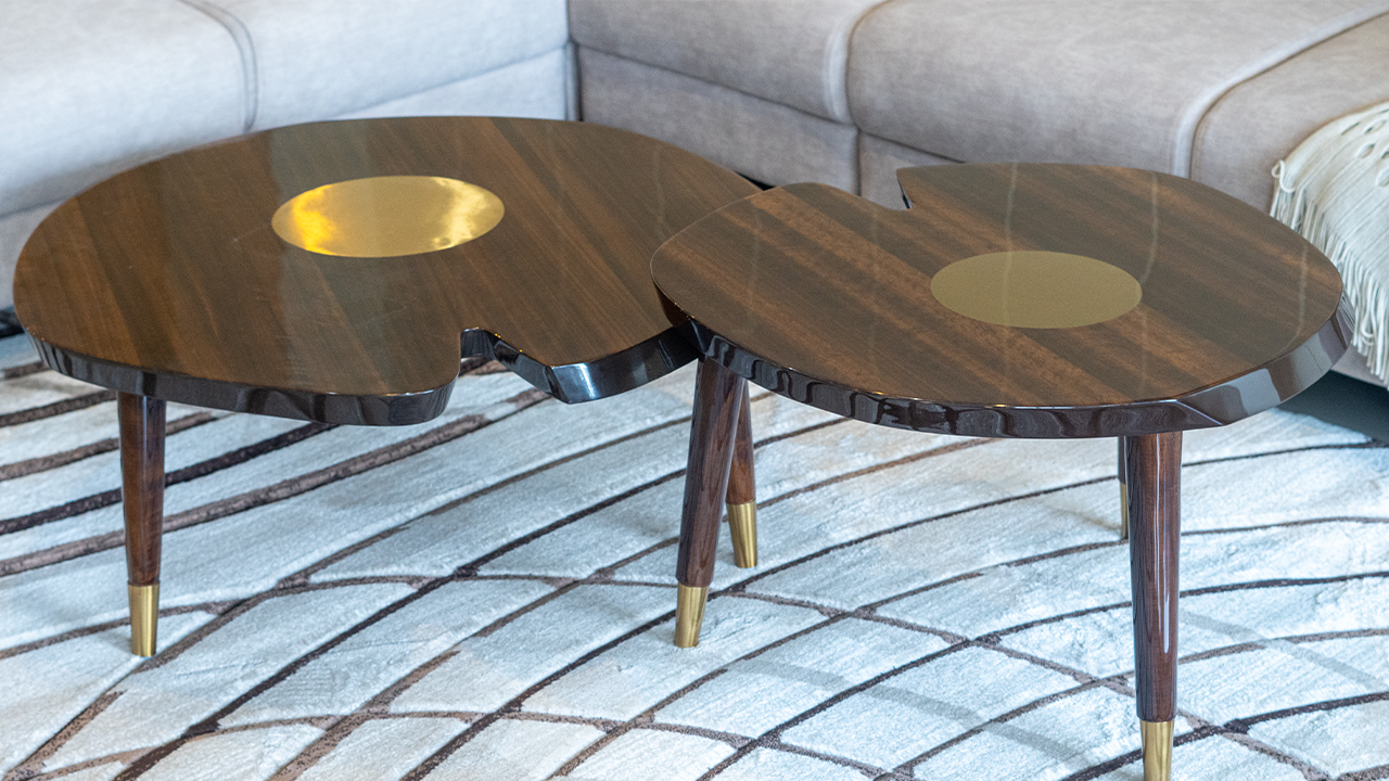 "This center table captures attention with its artistic, nature-inspired form and rich, luxurious finish. Comprising two interlocking wooden tables shaped like abstract petals or lily pads, it introduces an organic, sculptural quality to the space. The dark wood surface is beautifully accented by circular brass inlays that gleam subtly, adding a touch of opulence without overwhelming the natural elegance of the design. Tapered legs with golden metal tips enhance the table’s refined look, blending mid-century charm with modern sophistication."