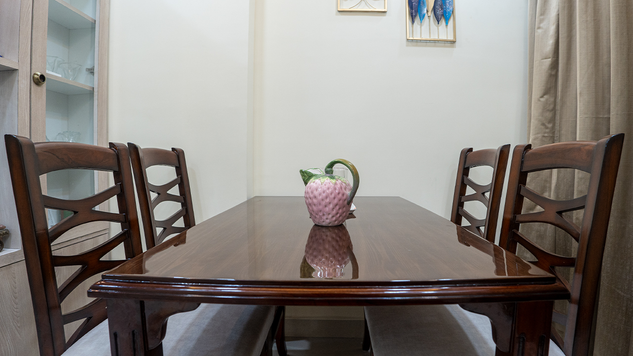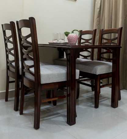 "Elevate your dining experience with our sophisticated dining table and chairs set, perfect for intimate gatherings and everyday meals. Crafted with dark wood, this set exudes warmth and refinement, complementing any home decor. Made from high-quality dark wood, the table boasts a sturdy construction and a smooth finish. Its compact size makes it ideal for small dining areas or kitchens. Four matching chairs with a unique lattice design on the backrests add a touch of elegance. The chairs feature comfortable cushions upholstered in a light-colored fabric, ensuring a pleasant seating experience. The set's classic design ensures it will remain stylish for years to come. The dark wood tone pairs well with a variety of interior styles, from traditional to modern."
