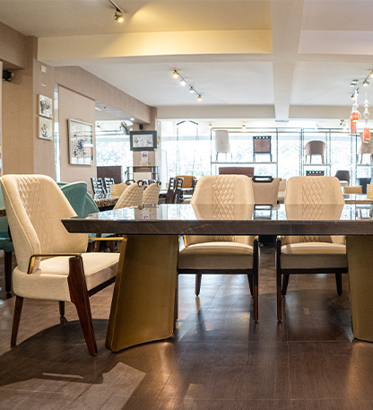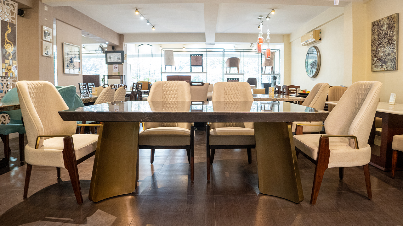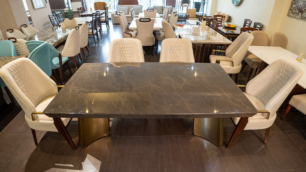 "The dining table boasts a stunning dark brown marble top, its glossy finish reflecting light and adding a touch of sophistication to the overall design. The table's base is equally impressive, featuring two curved gold legs that provide stability and support while injecting a sense of luxury into the room. The four chairs arranged around the table are upholstered in a creamy white fabric, offering a comfortable seating option for diners. The chairs' dark brown legs add a touch of warmth and coziness to the overall design, while the gold accents on the armrests introduce a hint of elegance and refinement. The combination of dark marble, gold accents, and creamy white upholstery creates a sophisticated and inviting atmosphere, perfect for hosting dinner parties or special occasions. The table and chairs exude a sense of high-end quality, making them a stylish addition to any dining room."