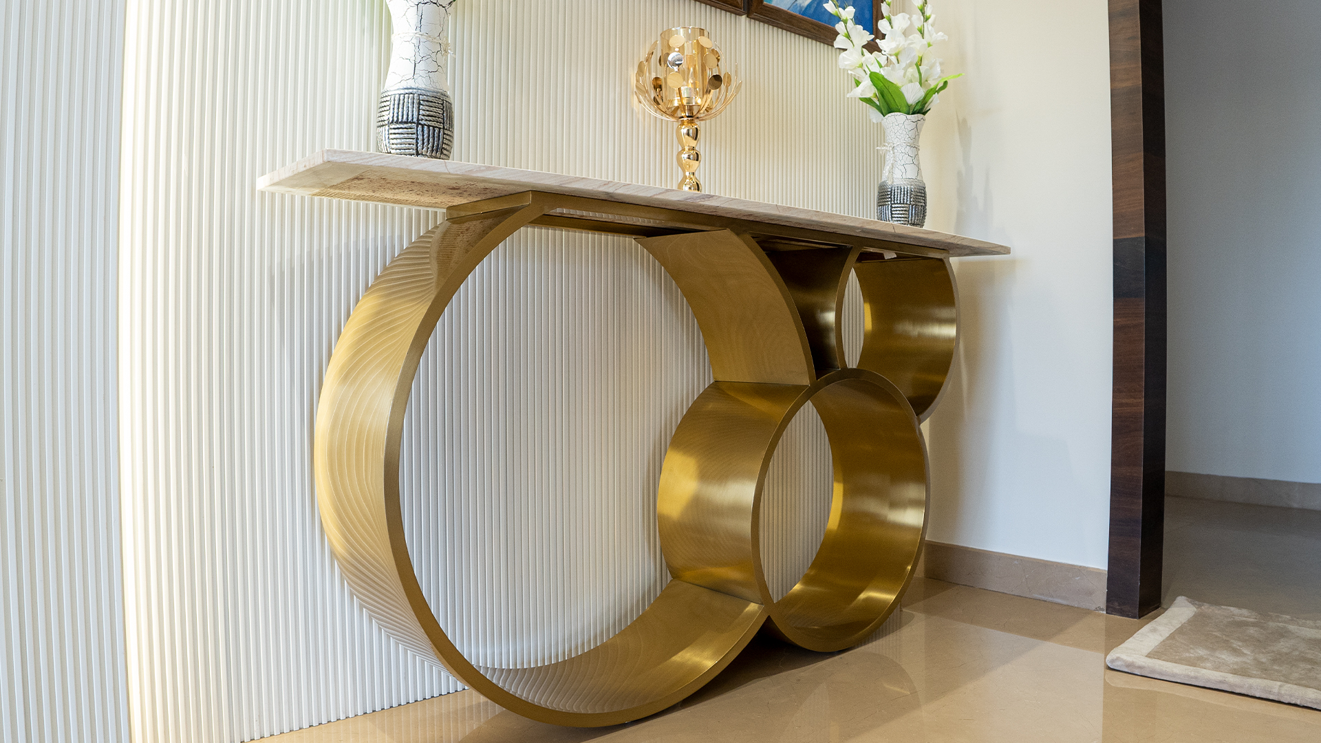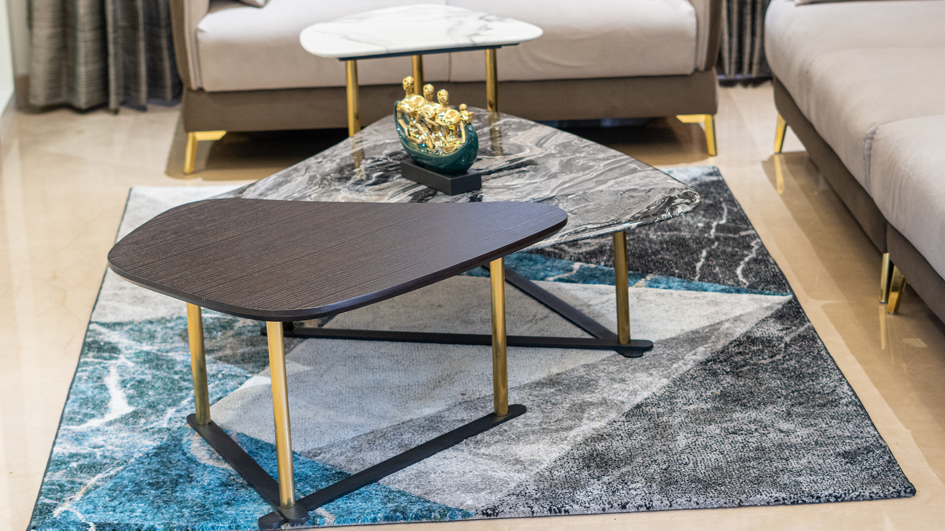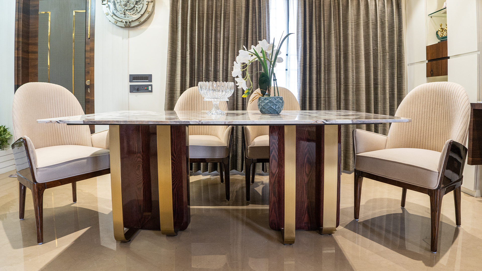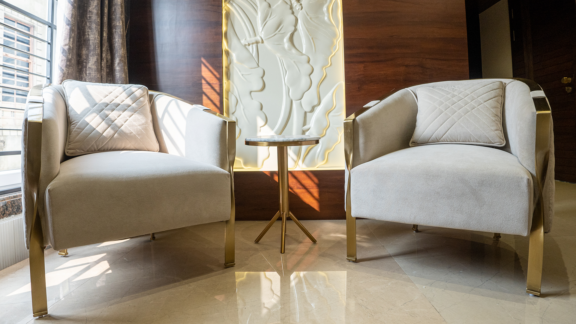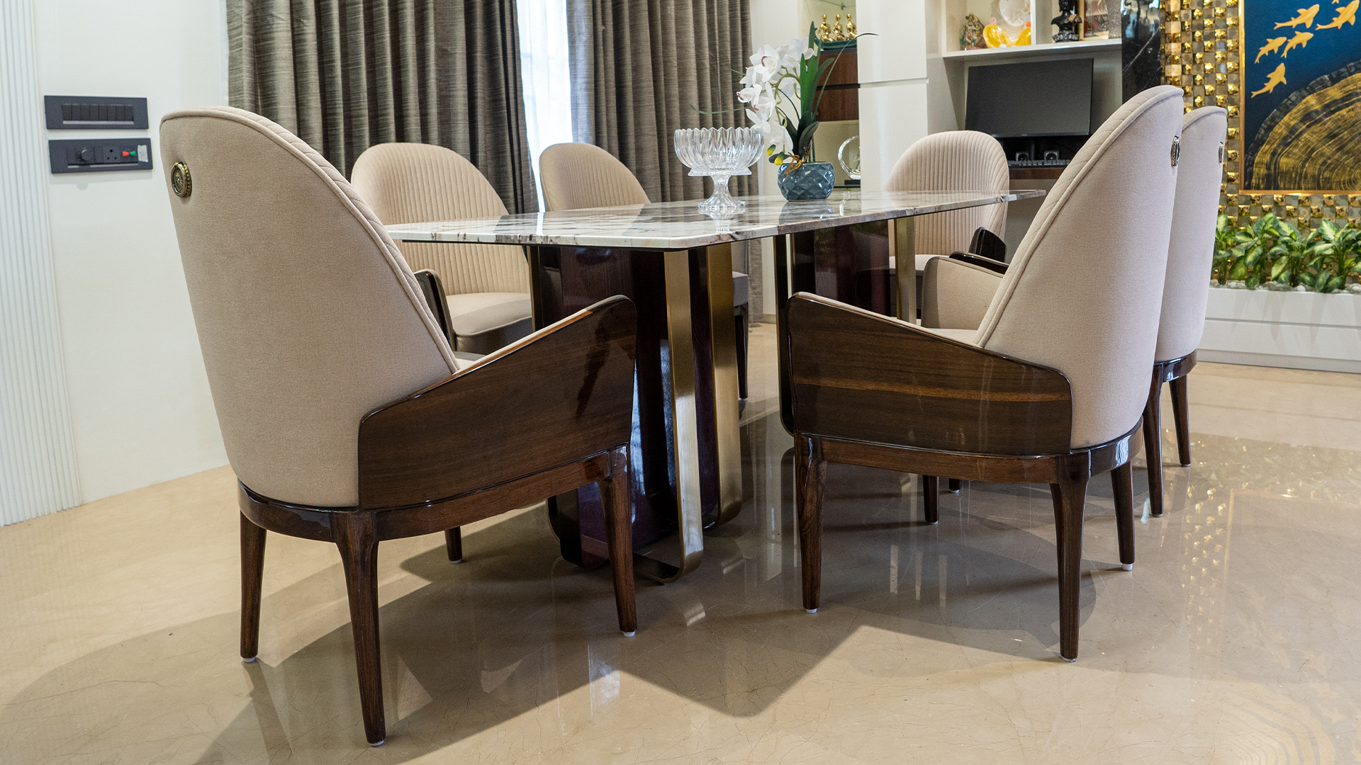 Meticulously balanced with the richness of smooth monotone backdrop, the living interior sings into the oasis of bold coloration and mixed textiles. A rapturing play of geometric patterns with up scaled carpet crisply defines the fluidity and expresses the vocabulary of open layout. The clean ceiling design with indirect light draws the gaze into the spaces, and gently quells with the pop of the fabrics over viewing the silent yet classic deluxe of the interiors.