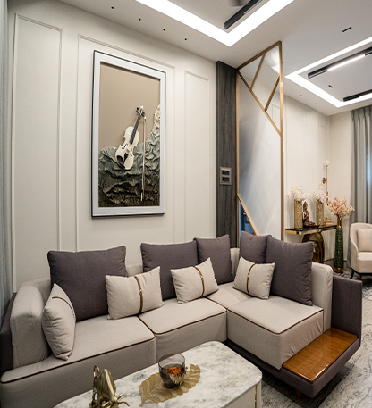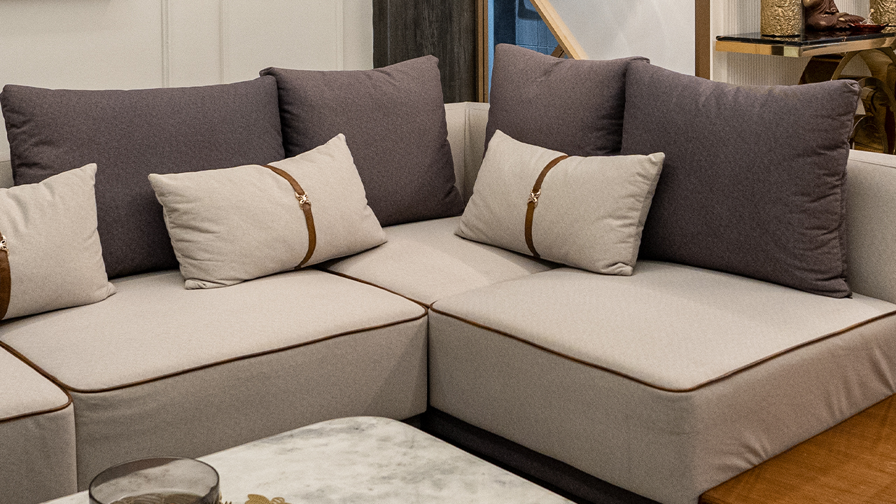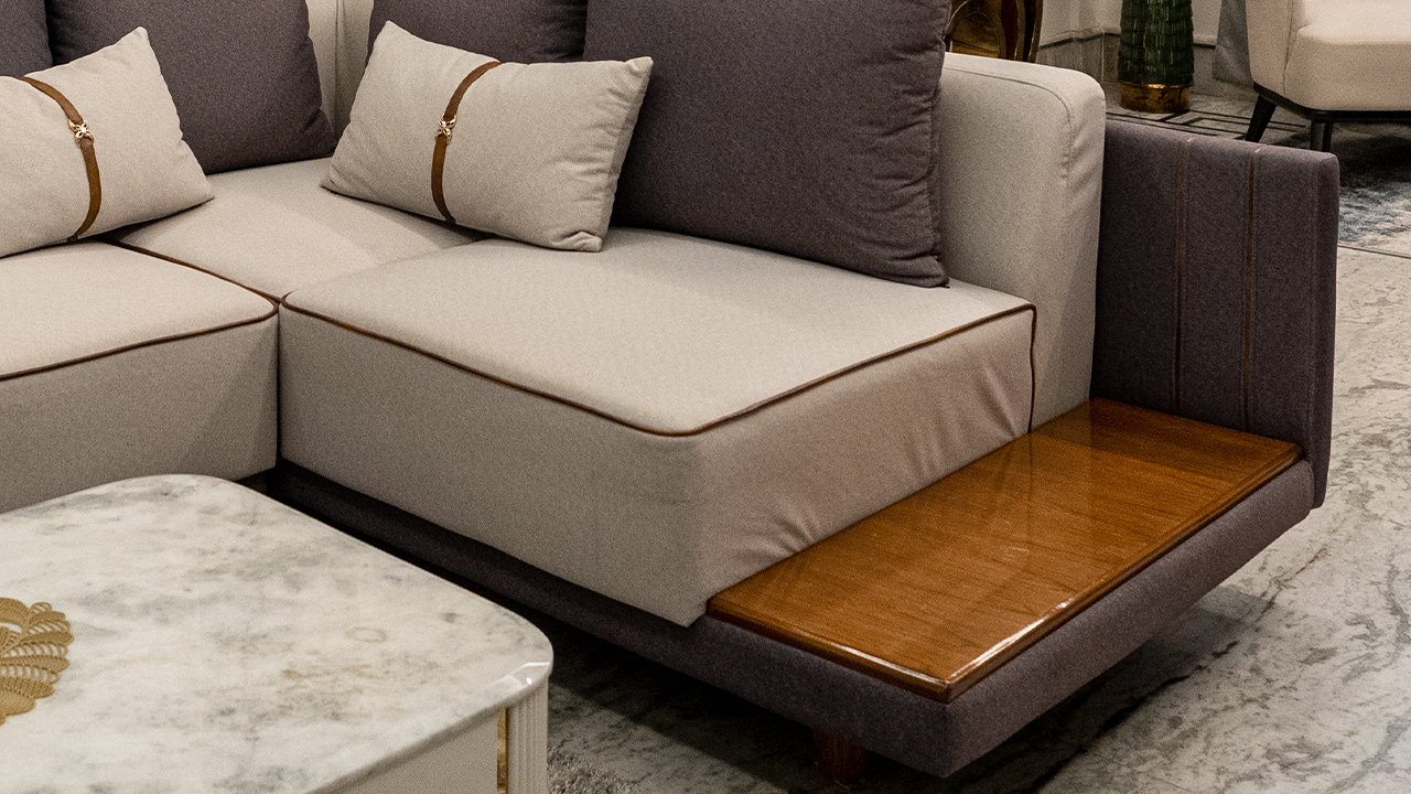 Add a touch of sophistication to your living space with this stylish L-shaped sofa and marble-top coffee table set. Upholstered in a chic two-tone fabric of beige and grey, the sofa features plush cushions, supportive armrests, and elegant wooden detailing for a refined, modern look. Paired with a sleek white coffee table topped with premium marble and soft curved edges, this ensemble is perfect for both everyday comfort and elegant entertaining.
