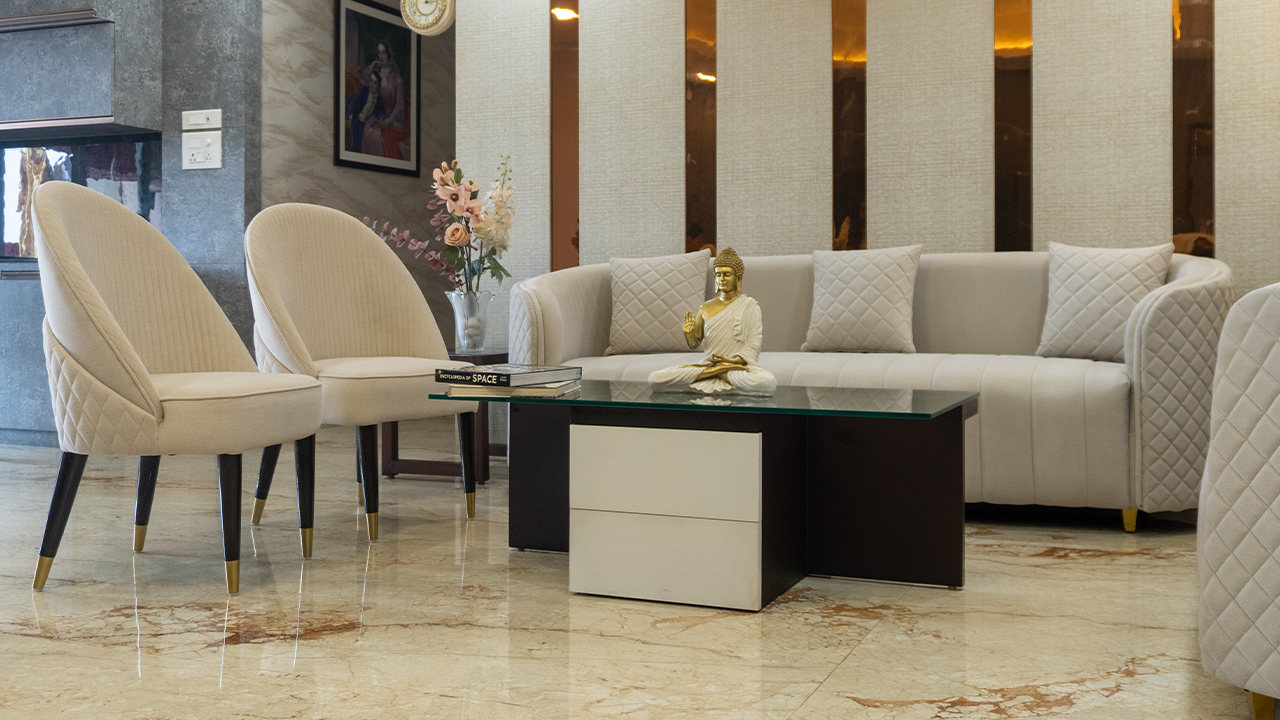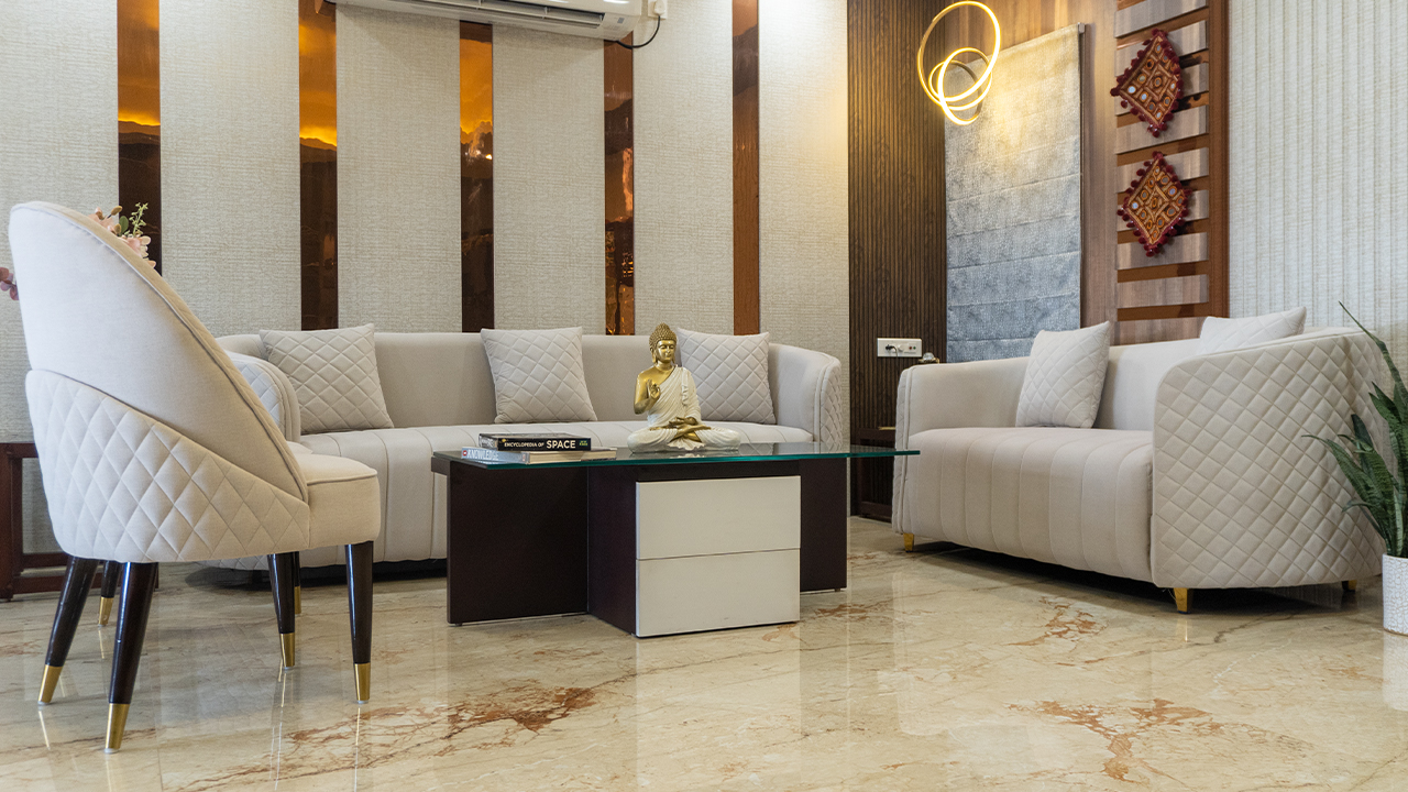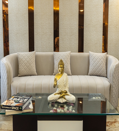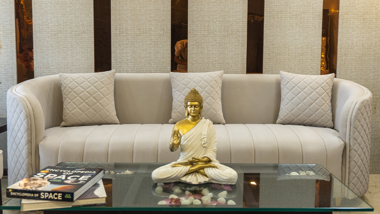 Experience the perfect blend of style and comfort in this beautifully designed living room. The space features a stunning light-colored sofa set, complete with quilted details and gold accents, paired with a sleek glass coffee table and elegant chairs. The room is adorned with decorative elements, including a golden Buddha statue, books, and a vase of flowers. The walls are designed with a mix of textures and patterns, adding depth and visual interest to the space. The overall aesthetic is one of understated luxury and sophistication, making it the perfect setting for relaxation and entertainment. This living room is ideal for those who appreciate modern design and comfort, and is sure to be a cozy retreat for years to come.