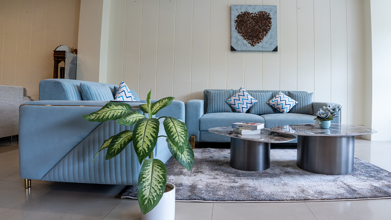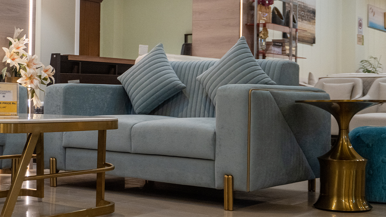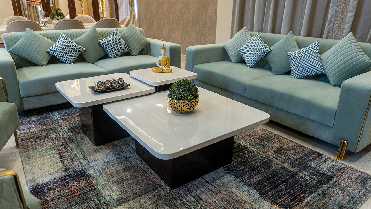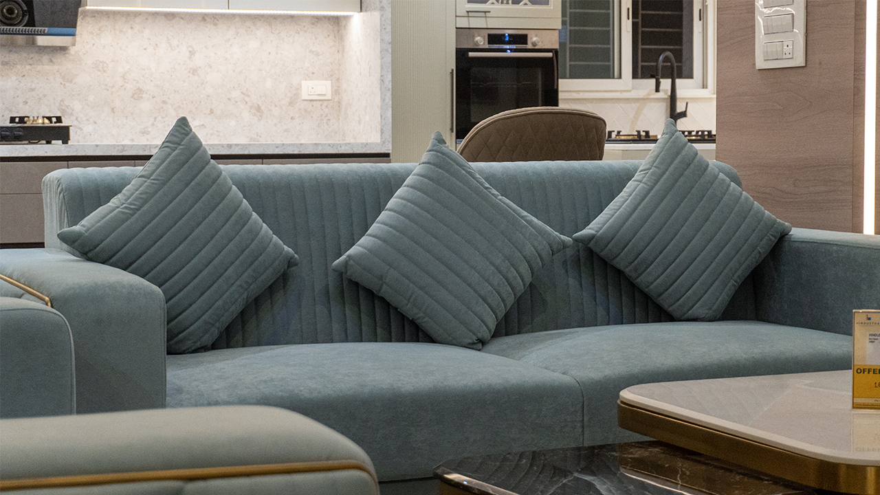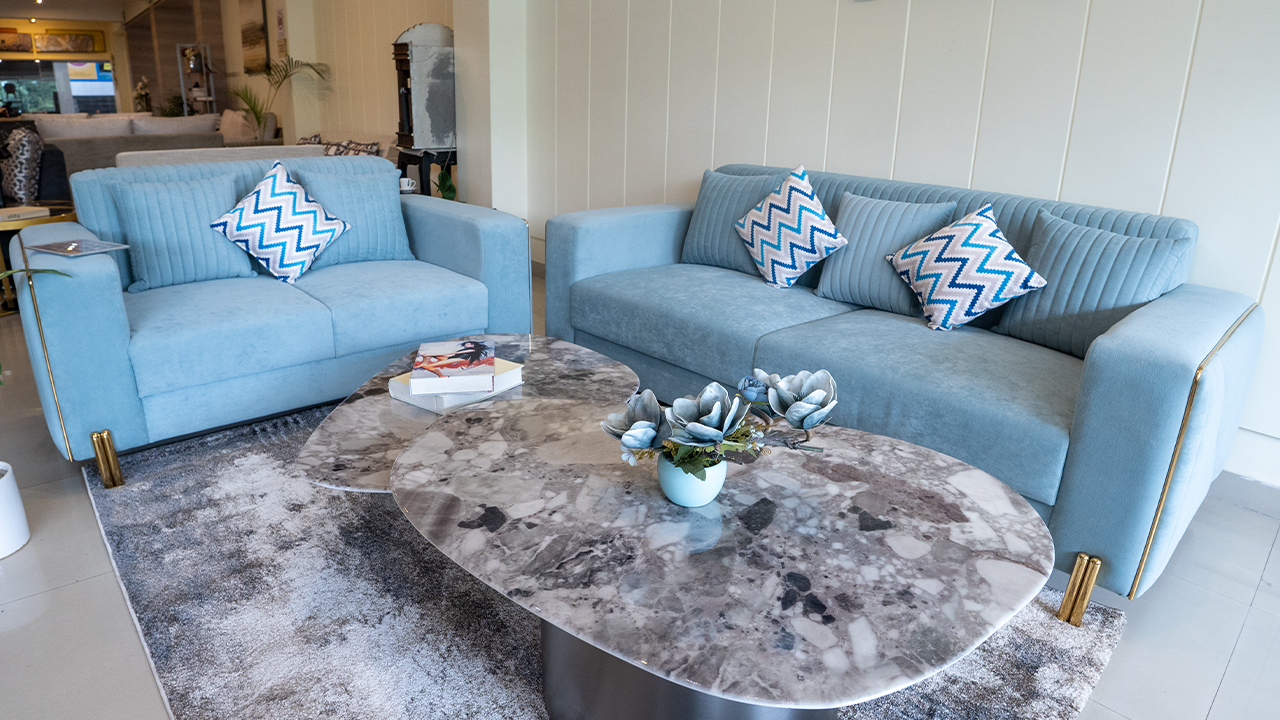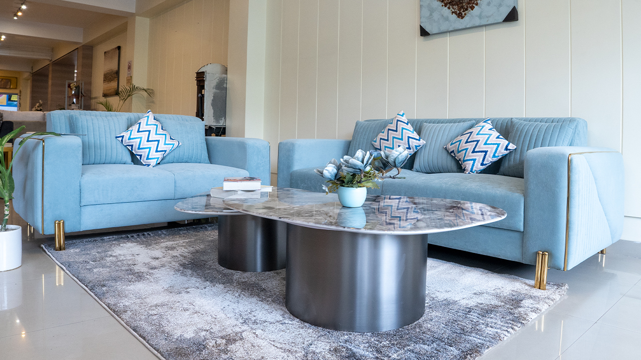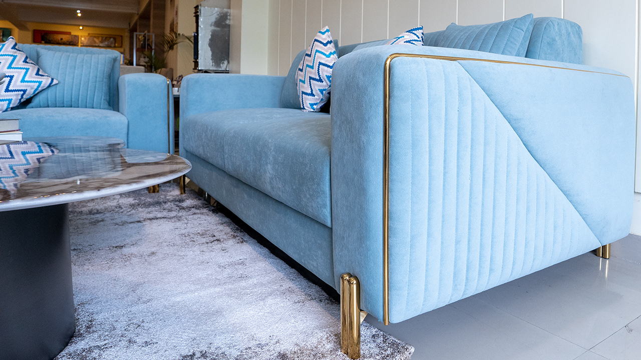 Introduce a sense of modern luxury to your living room with this elegant velvet sofa set, featuring plush cushioning, clean lines, and striking gold detailing. Upholstered in a soothing teal blue shade, the sofas are adorned with vertically stitched back cushions for both comfort and style. The set is beautifully complemented by dual-tone marble-top center and side tables with a sleek gold-finished metal base – adding a touch of sophistication and glam to your space. Ideal for contemporary homes, this ensemble is perfect for entertaining or relaxing in style.