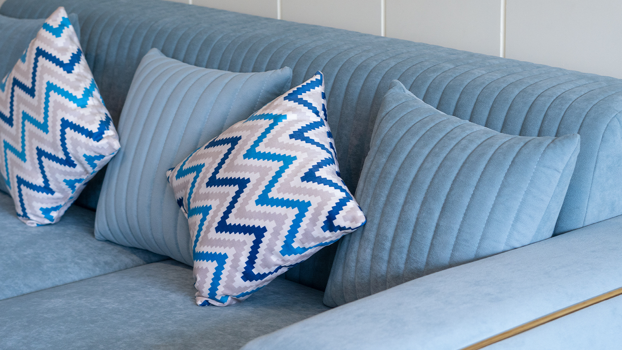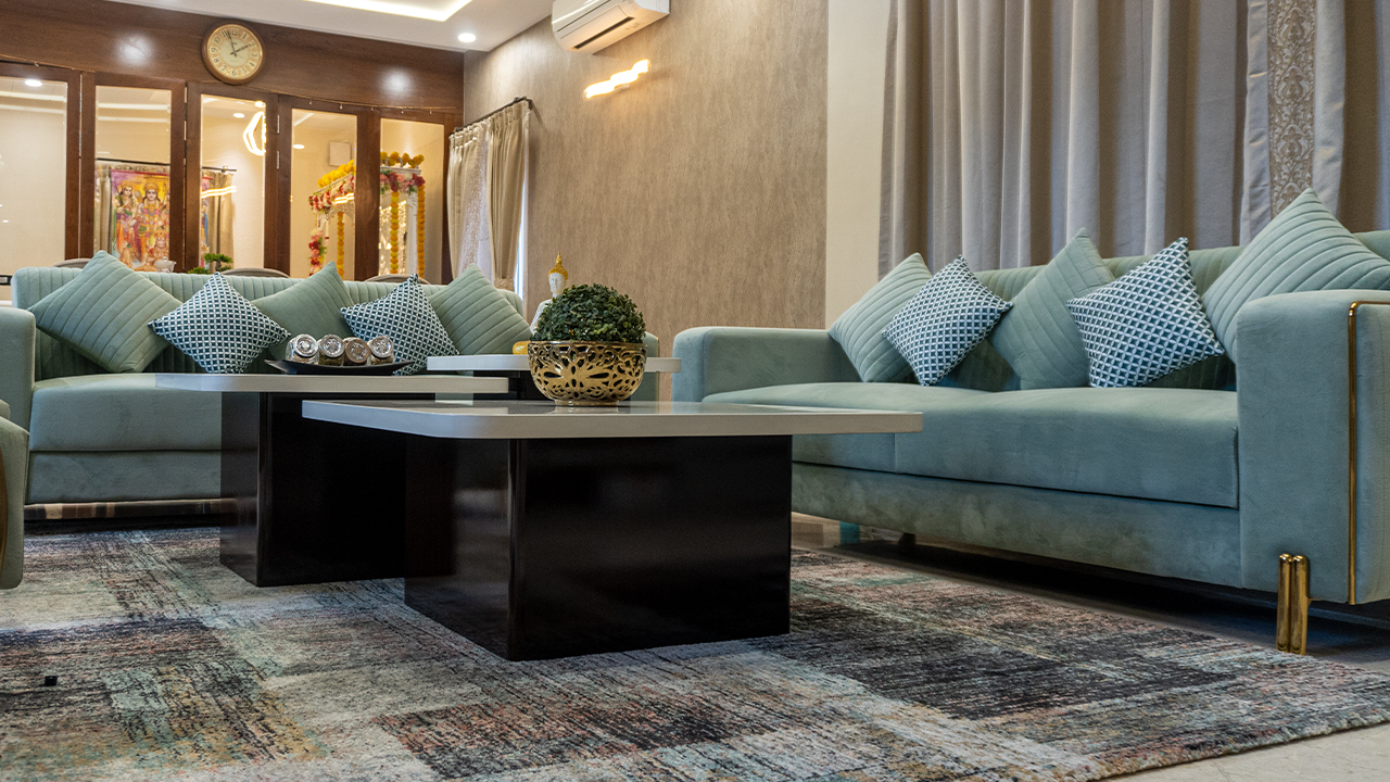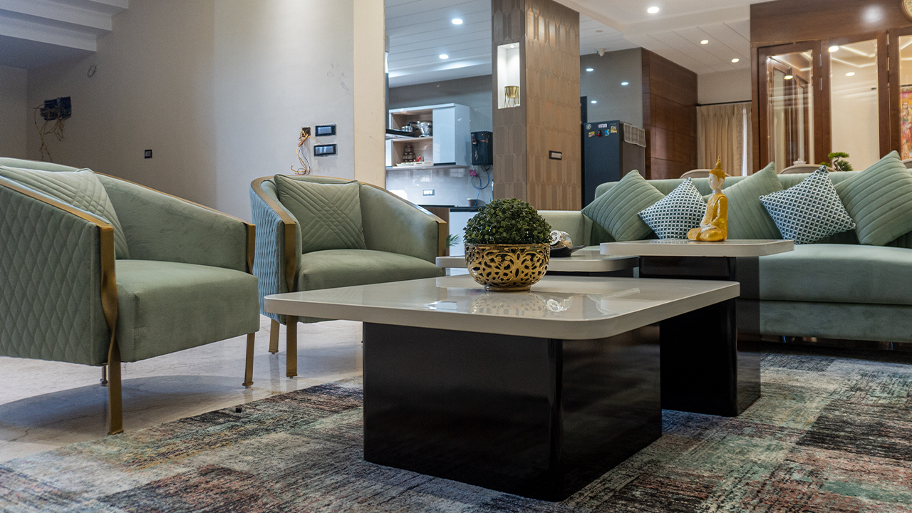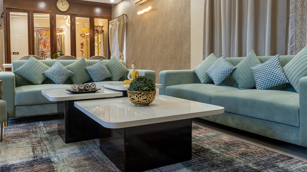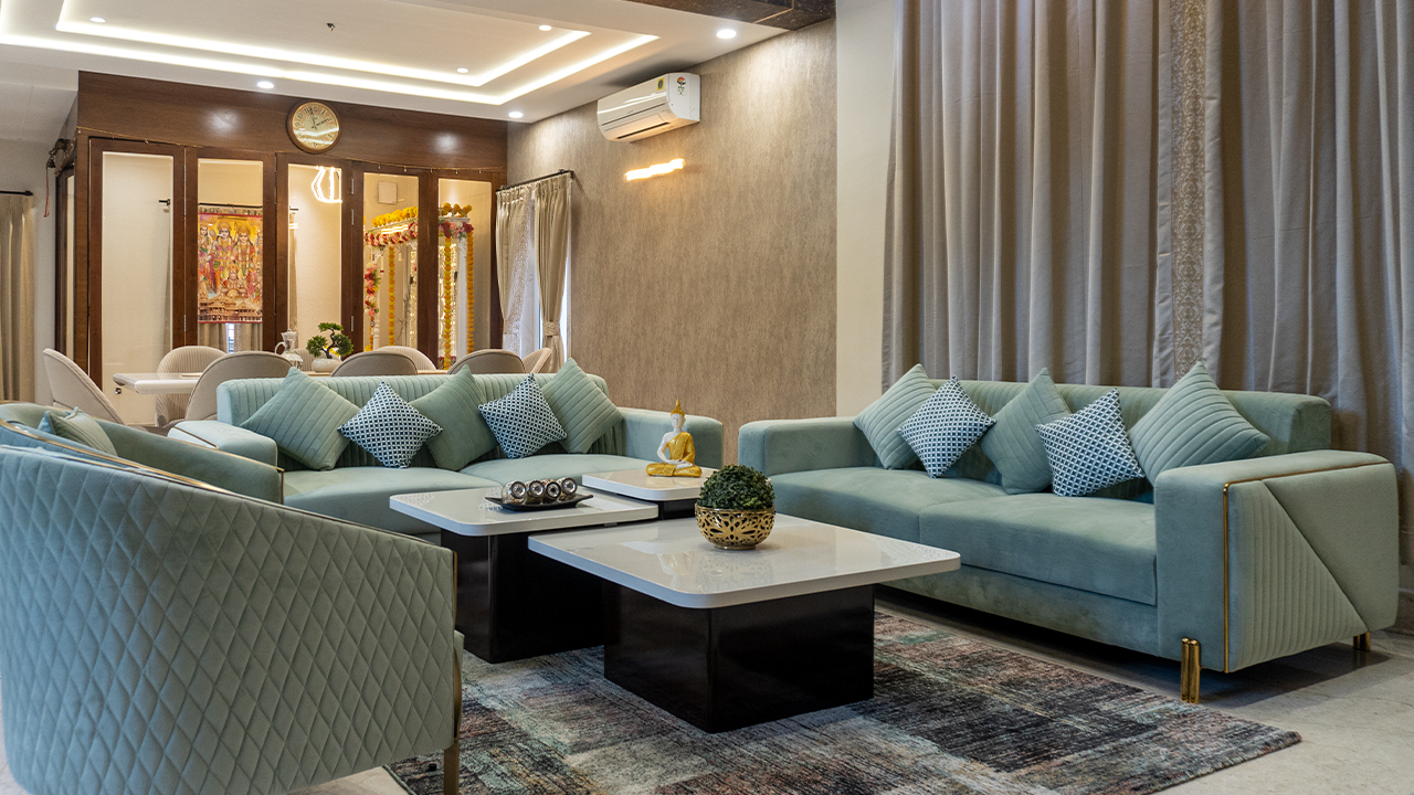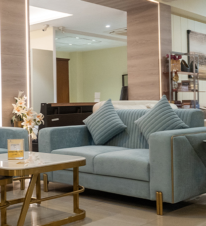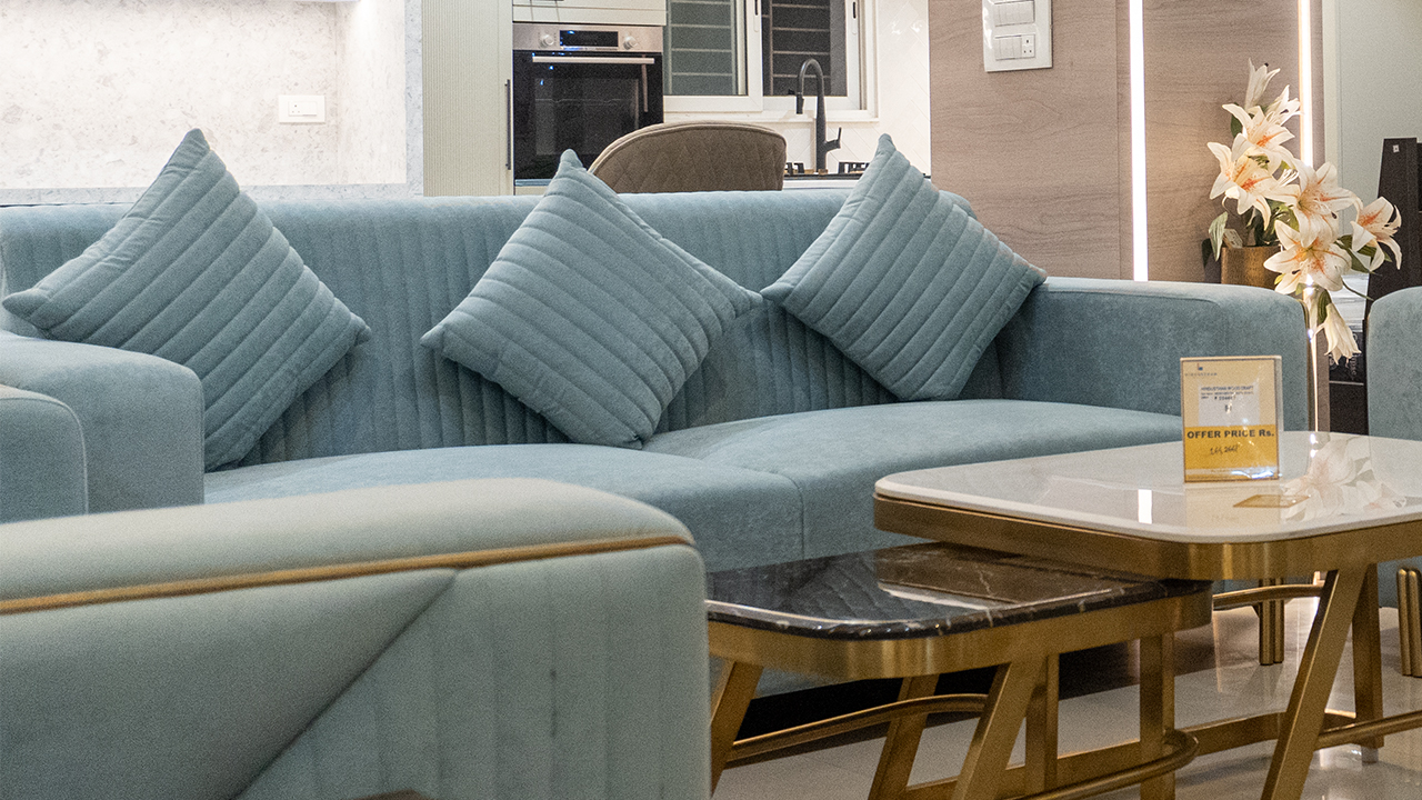Introduce a sense of modern luxury to your living room with this elegant velvet sofa set, featuring plush cushioning, clean lines, and striking gold detailing. Upholstered in a soothing teal blue shade, the sofas are adorned with vertically stitched back cushions for both comfort and style. The set is beautifully complemented by dual-tone marble-top center and side tables with a sleek gold-finished metal base – adding a touch of sophistication and glam to your space. Ideal for contemporary homes, this ensemble is perfect for entertaining or relaxing in style.