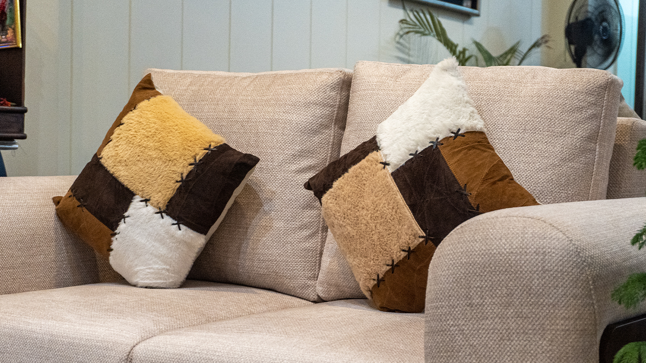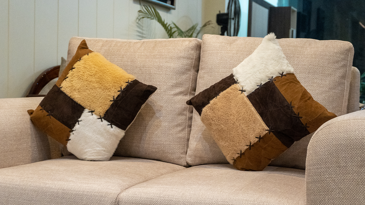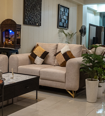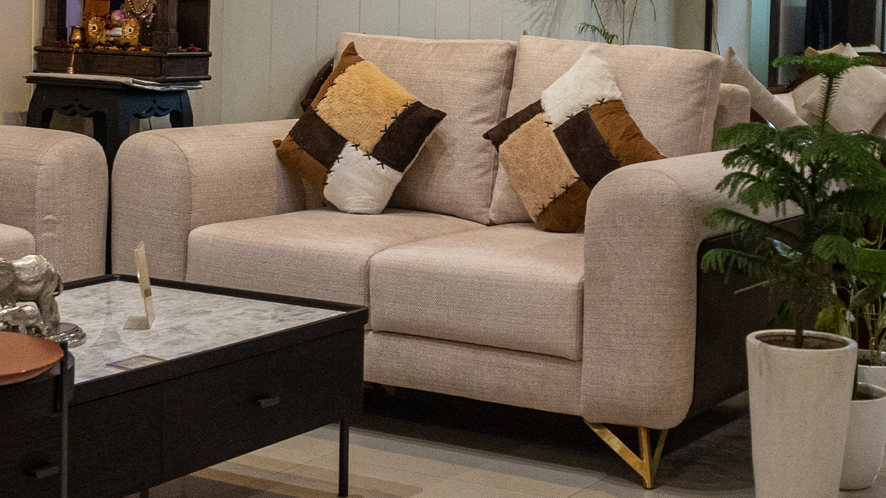 Elevate the charm of your living room with this classic beige 2-seater sofa, a timeless piece that blends comfort with elegance. Upholstered in a soft, woven fabric, this sofa offers a warm neutral tone that complements any décor style—from contemporary to rusti. The generously padded armrests and backrest provide superb comfort, making it an ideal spot for casual conversations or cozy evenings. The sofa comes paired with eye-catching patchwork throw cushions in earthy tones of brown, ochre, and cream, adding a pop of texture and artisanal flair. Compact yet stylish, this piece is perfect for apartments, small living rooms, or reading nooks where space is premium but style is non-negotiable.
