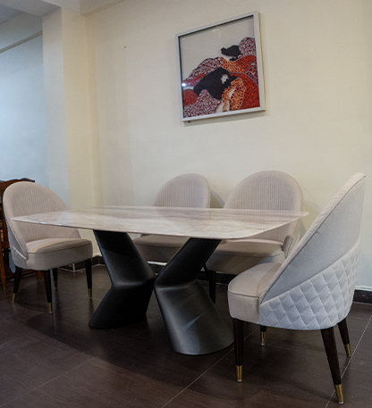 "Experience the epitome of luxury and sophistication with our exquisite dining table and chairs set, meticulously crafted to elevate your dining experience to new heights. Perfect for intimate gatherings, special occasions, and everyday meals, this stunning ensemble is sure to impress. The table boasts a beautiful light-colored wood top, adding warmth and invitation to the space, while its unique X-shaped black base provides stability, style, and a touch of modern elegance. The durable construction ensures long-lasting use, making it a valuable addition to your home. The four matching chairs are true masterpieces, featuring light-colored upholstery with a quilted design that exudes comfort and refinement. The high backrests provide ultimate support and comfort, while the tapered legs with gold accents add a touch of sophistication and glamour."