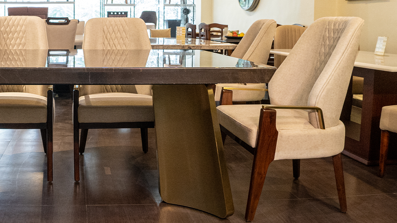 "The dining table boasts a stunning dark brown marble top, its glossy finish reflecting light and adding a touch of sophistication to the overall design. The table's base is equally impressive, featuring two curved gold legs that provide stability and support while injecting a sense of luxury into the room. The four chairs arranged around the table are upholstered in a creamy white fabric, offering a comfortable seating option for diners. The chairs' dark brown legs add a touch of warmth and coziness to the overall design, while the gold accents on the armrests introduce a hint of elegance and refinement. The combination of dark marble, gold accents, and creamy white upholstery creates a sophisticated and inviting atmosphere, perfect for hosting dinner parties or special occasions. The table and chairs exude a sense of high-end quality, making them a stylish addition to any dining room."