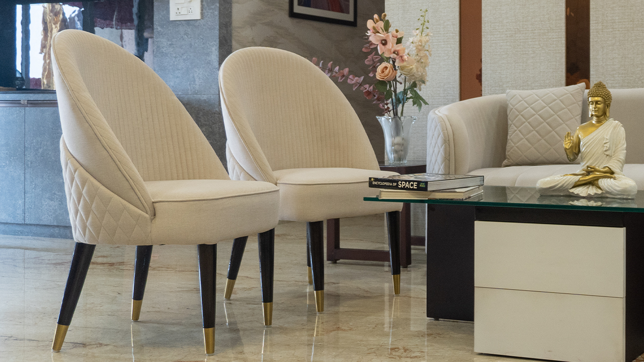 Experience the perfect blend of style and comfort in this beautifully designed living room. The space features a stunning light-colored sofa set, complete with quilted details and gold accents, paired with a sleek glass coffee table and elegant chairs. The room is adorned with decorative elements, including a golden Buddha statue, books, and a vase of flowers. The walls are designed with a mix of textures and patterns, adding depth and visual interest to the space. The overall aesthetic is one of understated luxury and sophistication, making it the perfect setting for relaxation and entertainment. This living room is ideal for those who appreciate modern design and comfort, and is sure to be a cozy retreat for years to come.