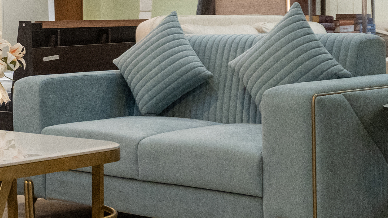 Introduce a sense of modern luxury to your living room with this elegant velvet sofa set, featuring plush cushioning, clean lines, and striking gold detailing. Upholstered in a soothing teal blue shade, the sofas are adorned with vertically stitched back cushions for both comfort and style. The set is beautifully complemented by dual-tone marble-top center and side tables with a sleek gold-finished metal base – adding a touch of sophistication and glam to your space. Ideal for contemporary homes, this ensemble is perfect for entertaining or relaxing in style.
