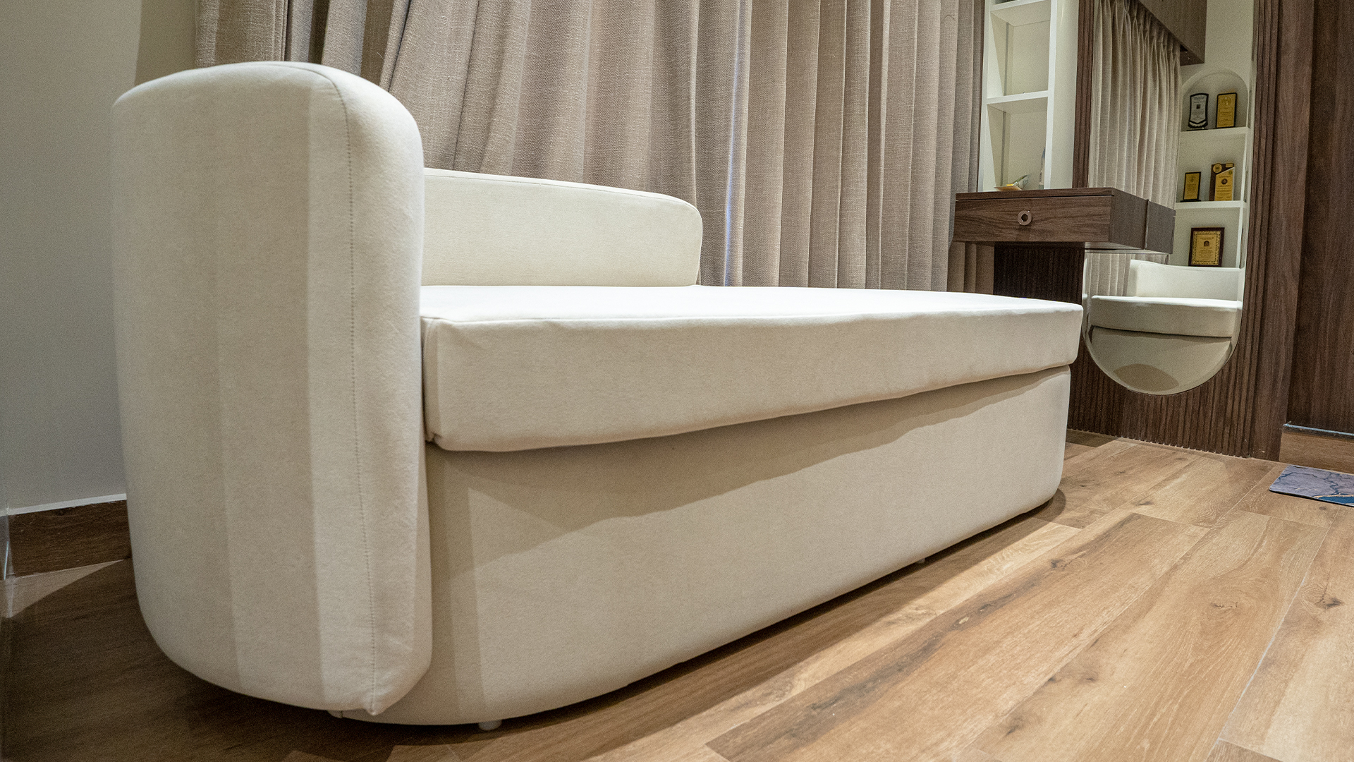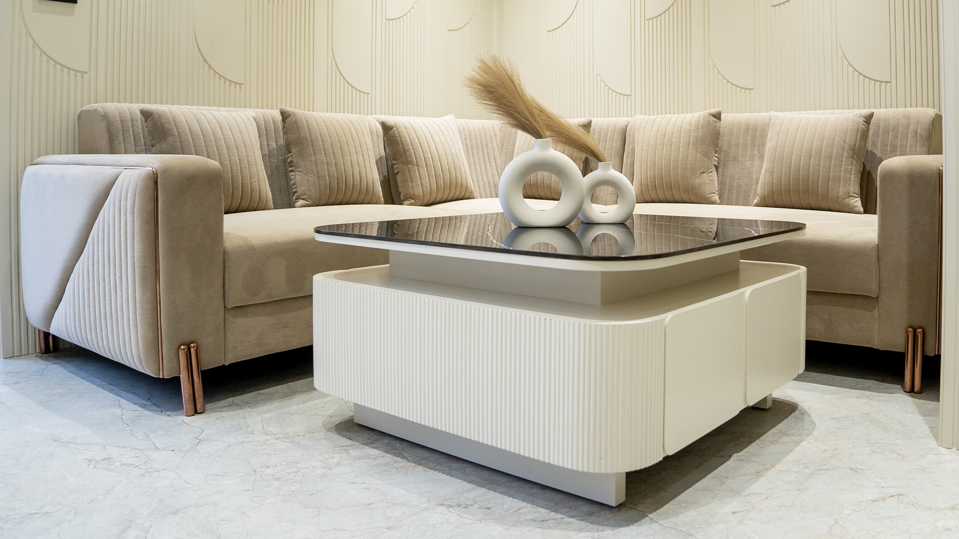 Meticulously balanced with the richness of smooth monotone backdrop, the living interior sings into the oasis of bold coloration and mixed textiles. A rapturing play of geometric patterns with up scaled carpet crisply defines the fluidity and expresses the vocabulary of open layout. The clean ceiling design with indirect light draws the gaze into the spaces, and gently quells with the pop of the fabrics over viewing the silent yet classic deluxe of the interiors.